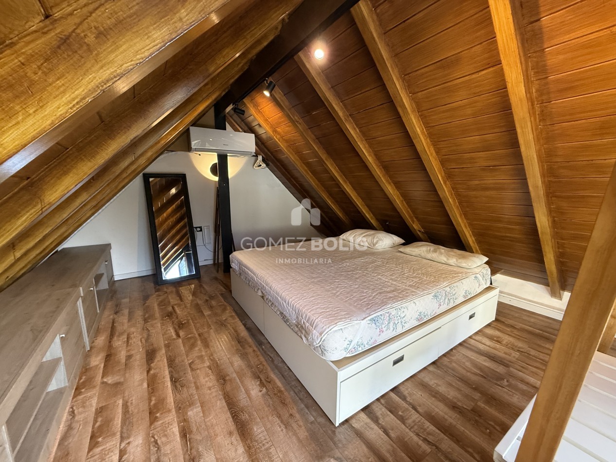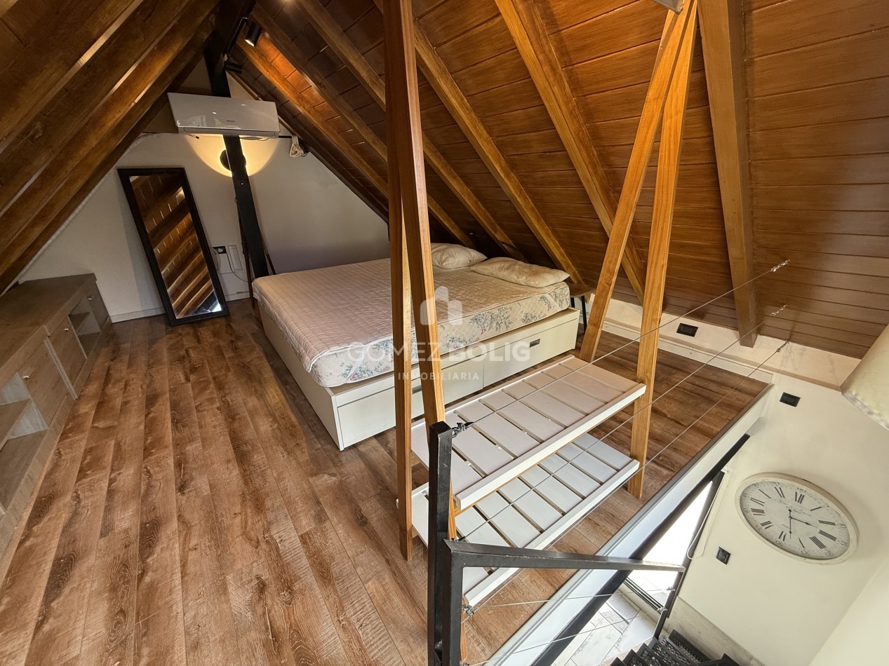 Dormitorio en Loft: Espacioso sector de descanso en planta alta con techos de madera a la vista que aportan calidez, excelente iluminación natural y aire acondicionado frío/calor instalado.