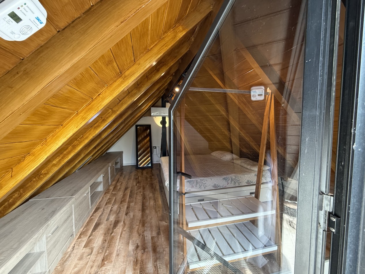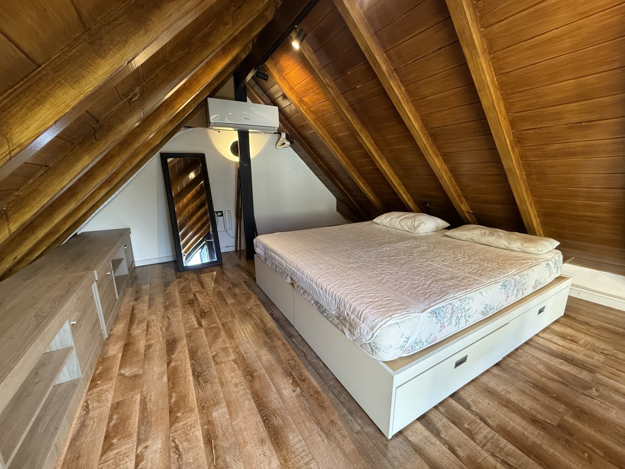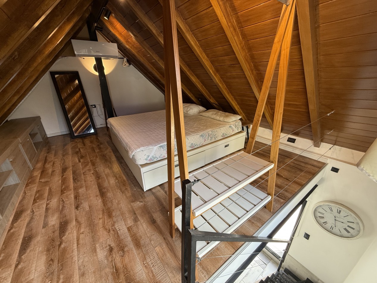 Dormitorio en Loft: Espacioso sector de descanso en planta alta con techos de madera a la vista que aportan calidez, excelente iluminación natural y aire acondicionado frío/calor instalado.